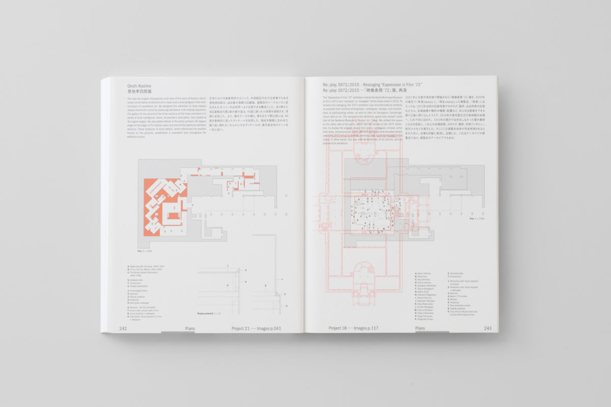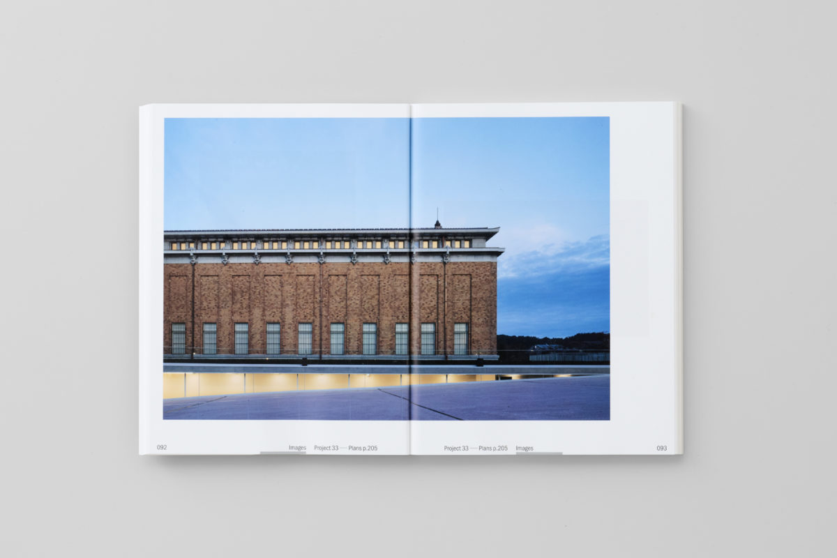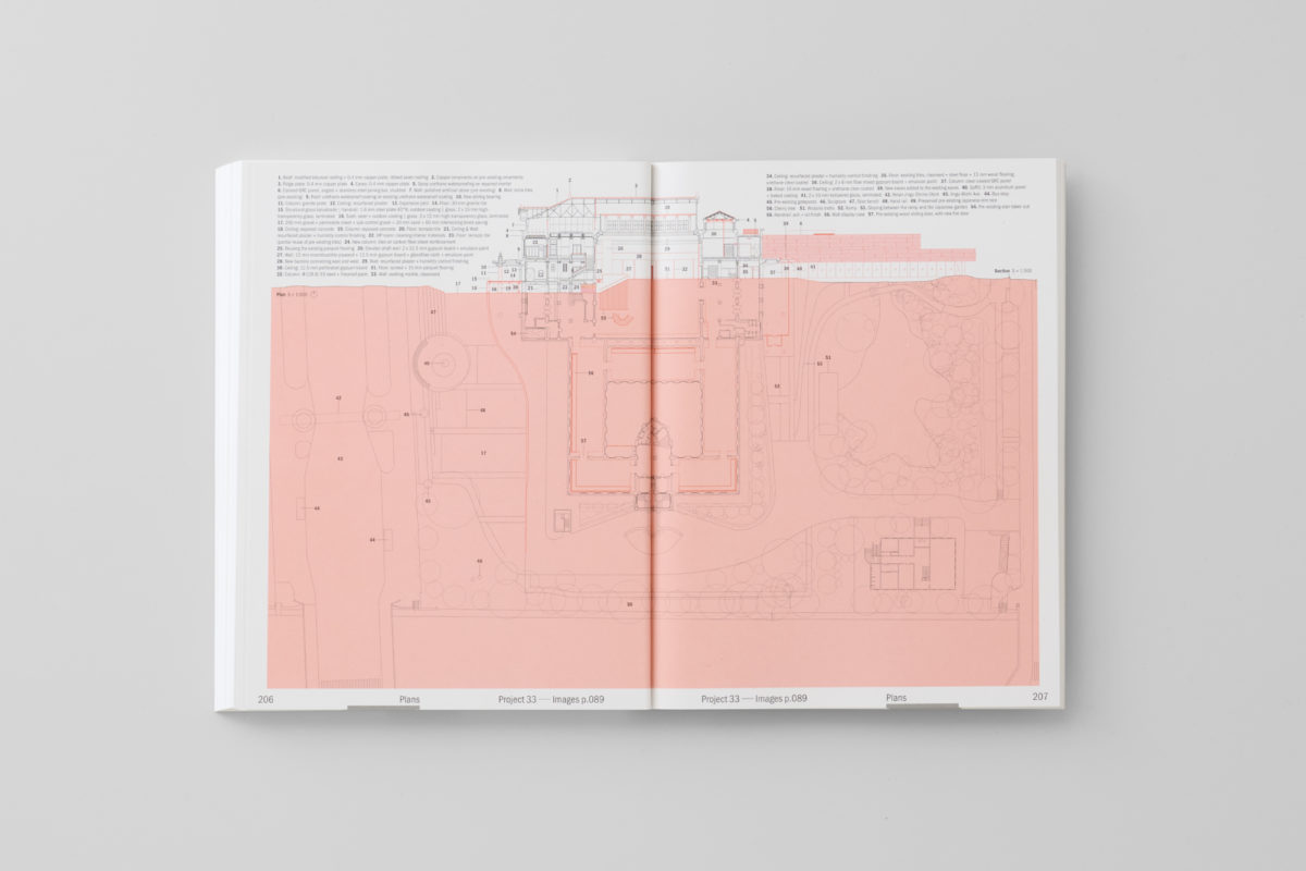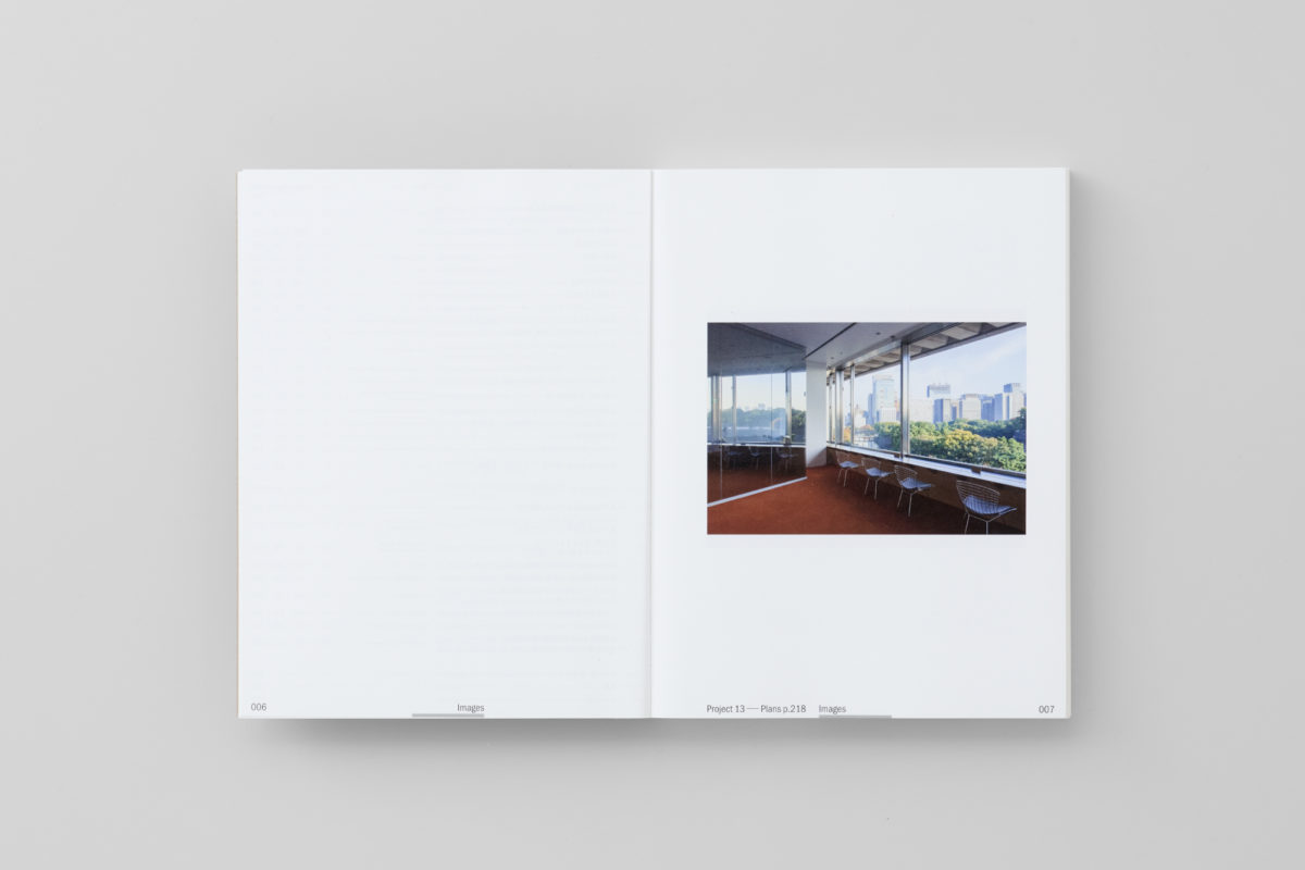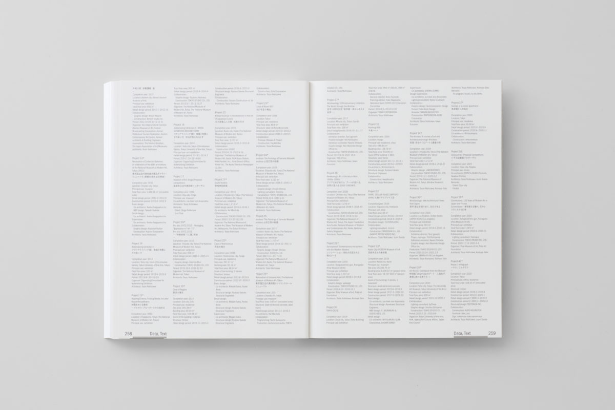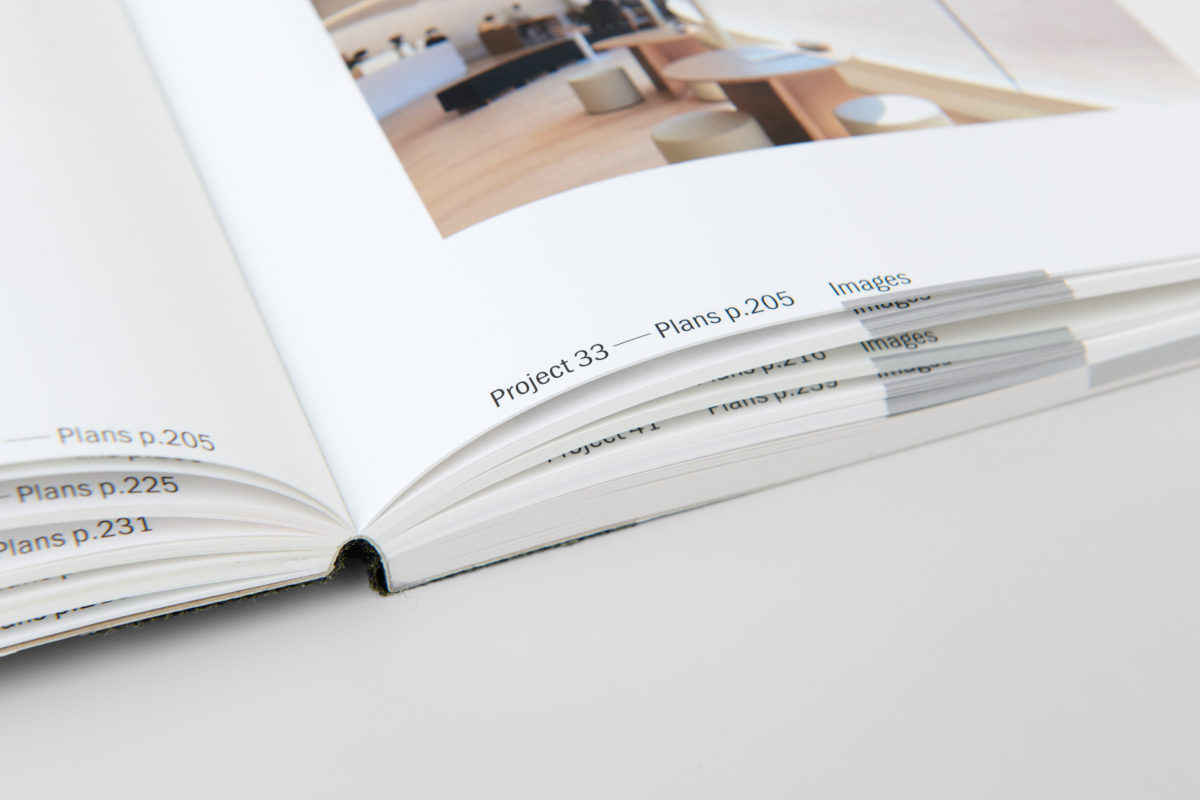 作品集では、冒頭から後半に至るまで多くのページが竣工写真に割かれています。それらはいくつかの定められた版型と余白を伴ったレイアウトで構成されており、撮影者や撮影方法、時期、場所がそれぞれ異なるにもかかわらず、一見すると一つの物語のようなシークエンスを形づくっています。このページネーションは、展示と同様に各プロジェクトの区切りや特徴を意図的に融解・細分化させることで、小さな発見が新たな関係性として結びつくとともに、空間に内包された痕跡の連なりによって建築の固有性を浮かび上がらせるものです。そのため、写真の選定と配置には細心の注意が払われています。 こうした視覚体験を成立させるため、各ページからはプロジェクト名や建築形態、用途といった情報が意図的に削ぎ落とされています。ただし、ノンブルと並置するかたちでプロジェクト番号と計画図面に対応するページ数が小さく記されており、後半にまとめられた詳細情報を索引できる仕組みになっています。また、本の小口から5種類の紙が用いられていることが確認でき、注意深く見れば紙の種類が建築の用途(公共建築、住宅、会場構成など)を示していることが読み取れます。罫下部分にはインデックス機能が印刷によって追加されており、イメージやプラン、テキストデータなどに即座にアクセスできるよう随所にアーカイブ機能が強調された設計になっています。