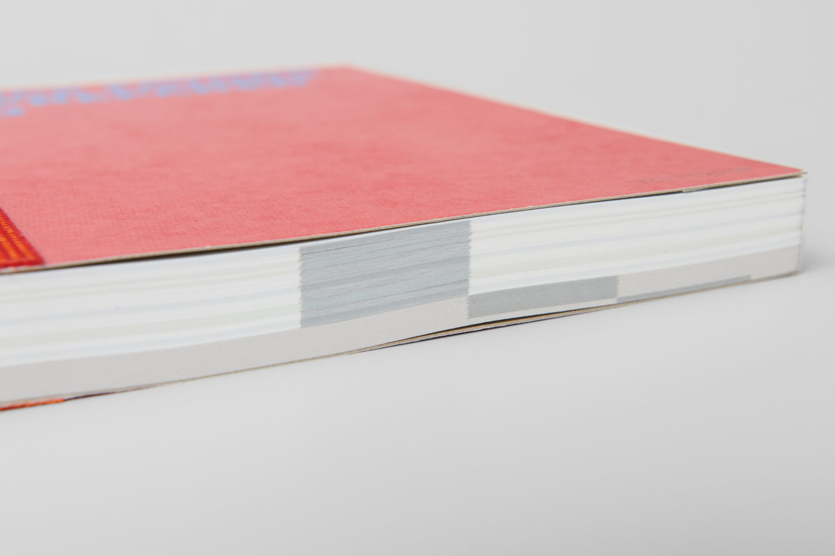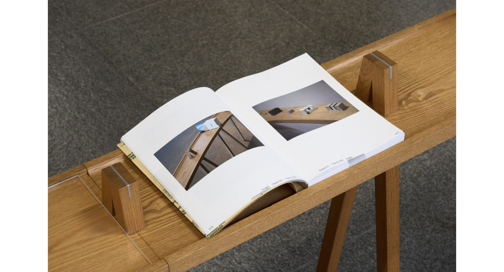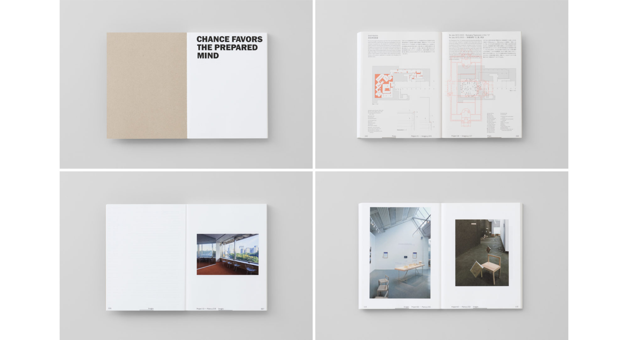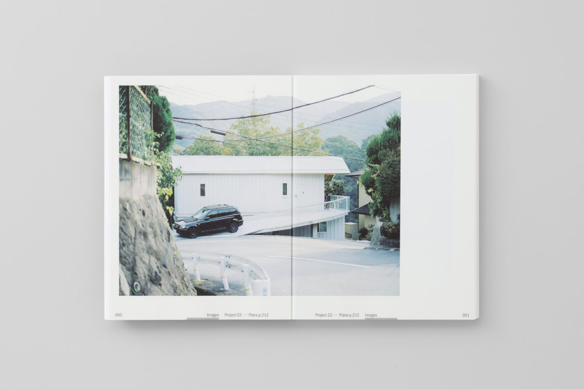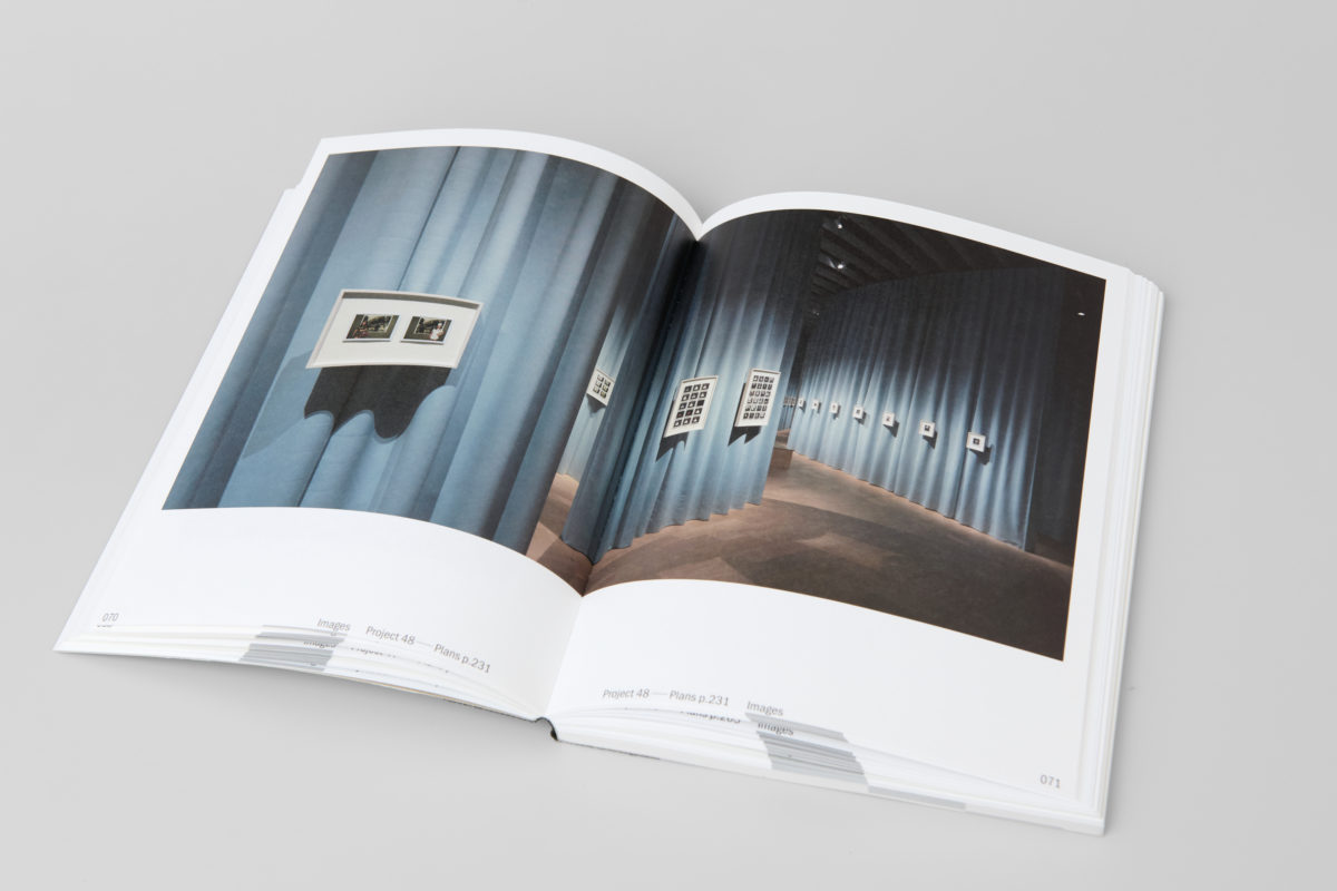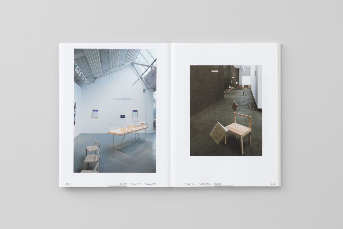 作品集では、冒頭から後半に至るまで多くのページが竣工写真に割かれています。それらはいくつかの定められた版型と余白を伴ったレイアウトで構成されており、撮影者や撮影方法、時期、場所がそれぞれ異なるにもかかわらず、一見すると一つの物語のようなシークエンスを形づくっています。このページネーションは、展示と同様に各プロジェクトの区切りや特徴を意図的に融解・細分化させることで、小さな発見が新たな関係性として結びつくとともに、空間に内包された痕跡の連なりによって建築の固有性を浮かび上がらせるものです。そのため、写真の選定と配置には細心の注意が払われています。 こうした視覚体験を成立させるため、各ページからはプロジェクト名や建築形態、用途といった情報が意図的に削ぎ落とされています。ただし、ノンブルと並置するかたちでプロジェクト番号と計画図面に対応するページ数が小さく記されており、後半にまとめられた詳細情報を索引できる仕組みになっています。また、本の小口から5種類の紙が用いられていることが確認でき、注意深く見れば紙の種類が建築の用途(公共建築、住宅、会場構成など)を示していることが読み取れます。罫下部分にはインデックス機能が印刷によって追加されており、イメージやプラン、テキストデータなどに即座にアクセスできるよう随所にアーカイブ機能が強調された設計になっています。